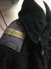 1st Lieutenant's tunic of the Fianna Éireann, 1917. Dark green with two rows of 4 plain brass buttons down the front, and one plain button on each cuff. On each shoulder strap is a mauve coloured cloth with a white band, the strap held by a plain brass button.