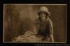 Photograph of Countess Markievicz shown reclining, supported by her left hand, wearing a hat and cloak. 5.2 inches by 3.1 inches.